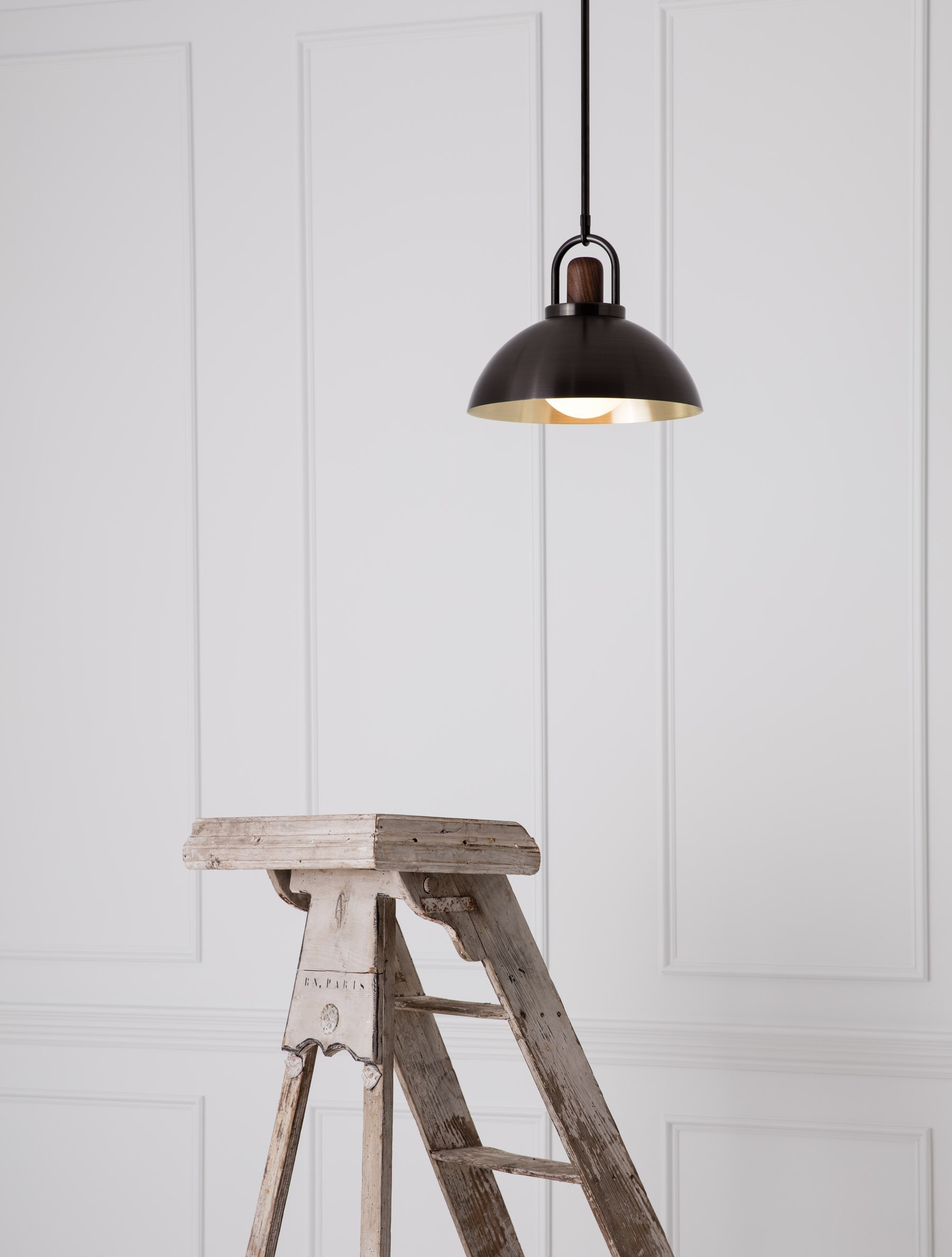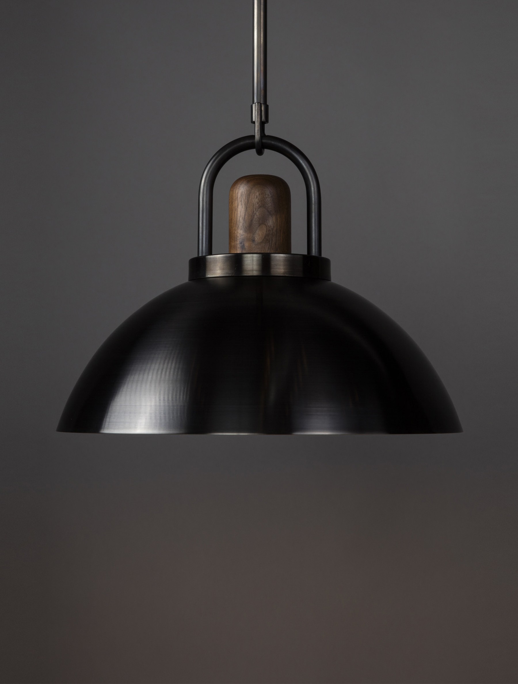 AVAILABLE IN TRIMLESS™The carefully shaped arc of the bent brass, and hand-turned Black Walnut top serve both an aesthetic and functional purpose. This hand-spun 14" dome is meticulously brushed and waxed to a matte satin finish. Height is cut to order.