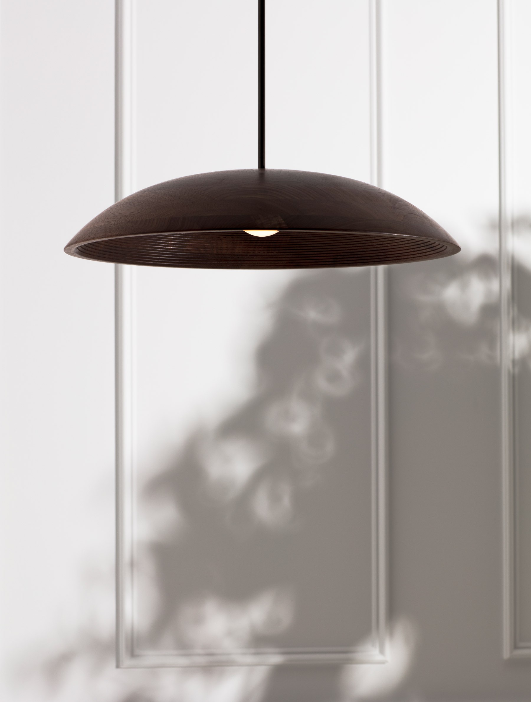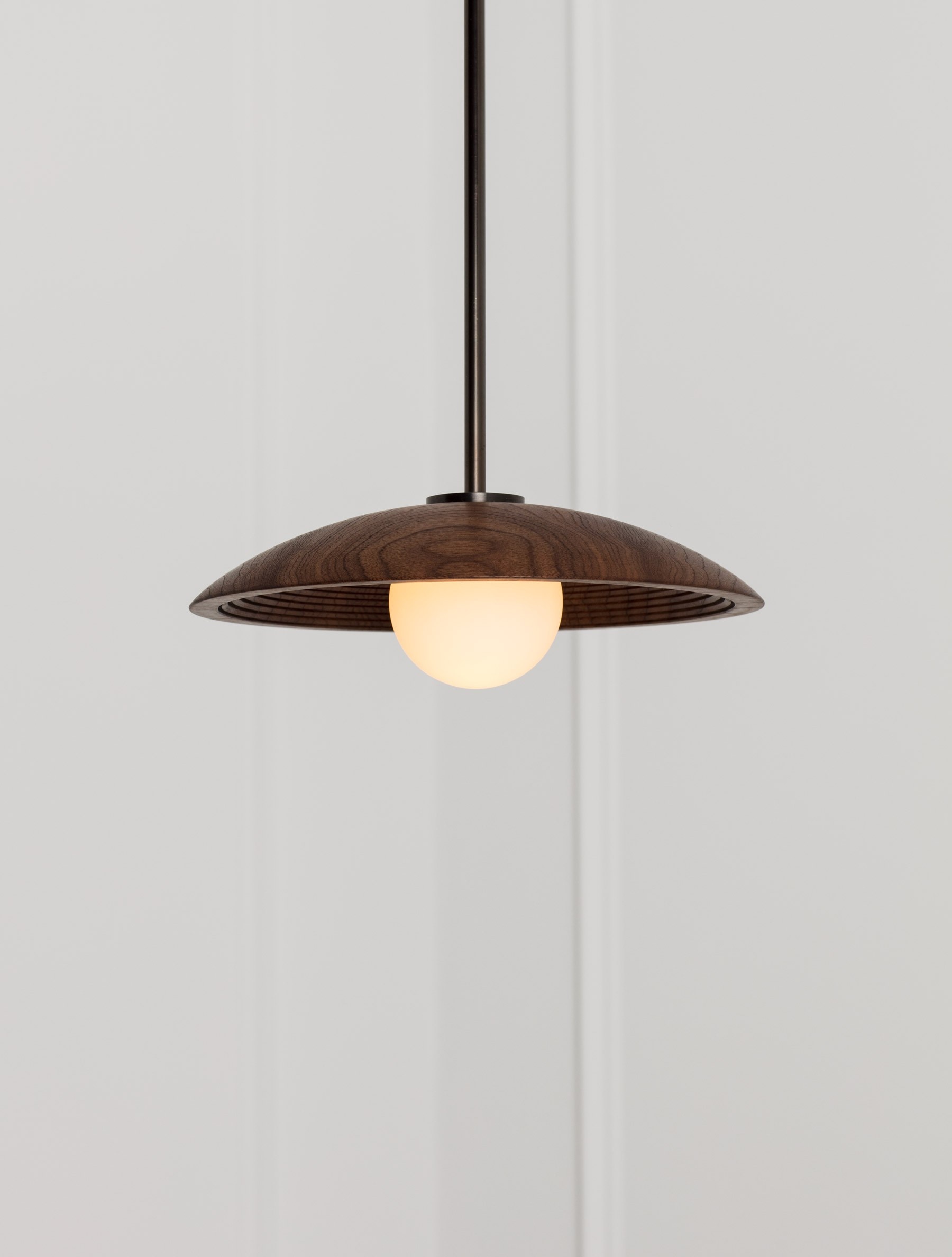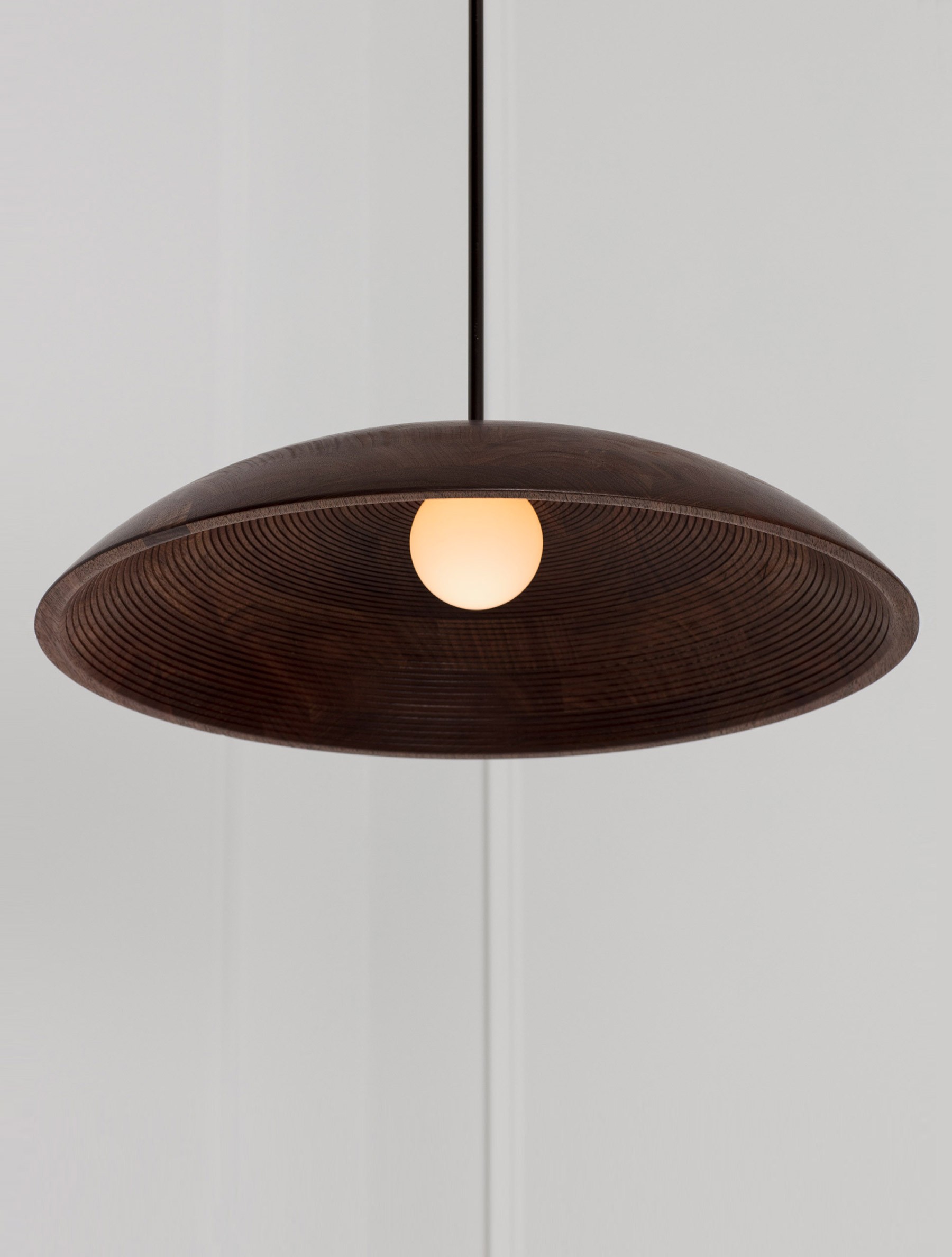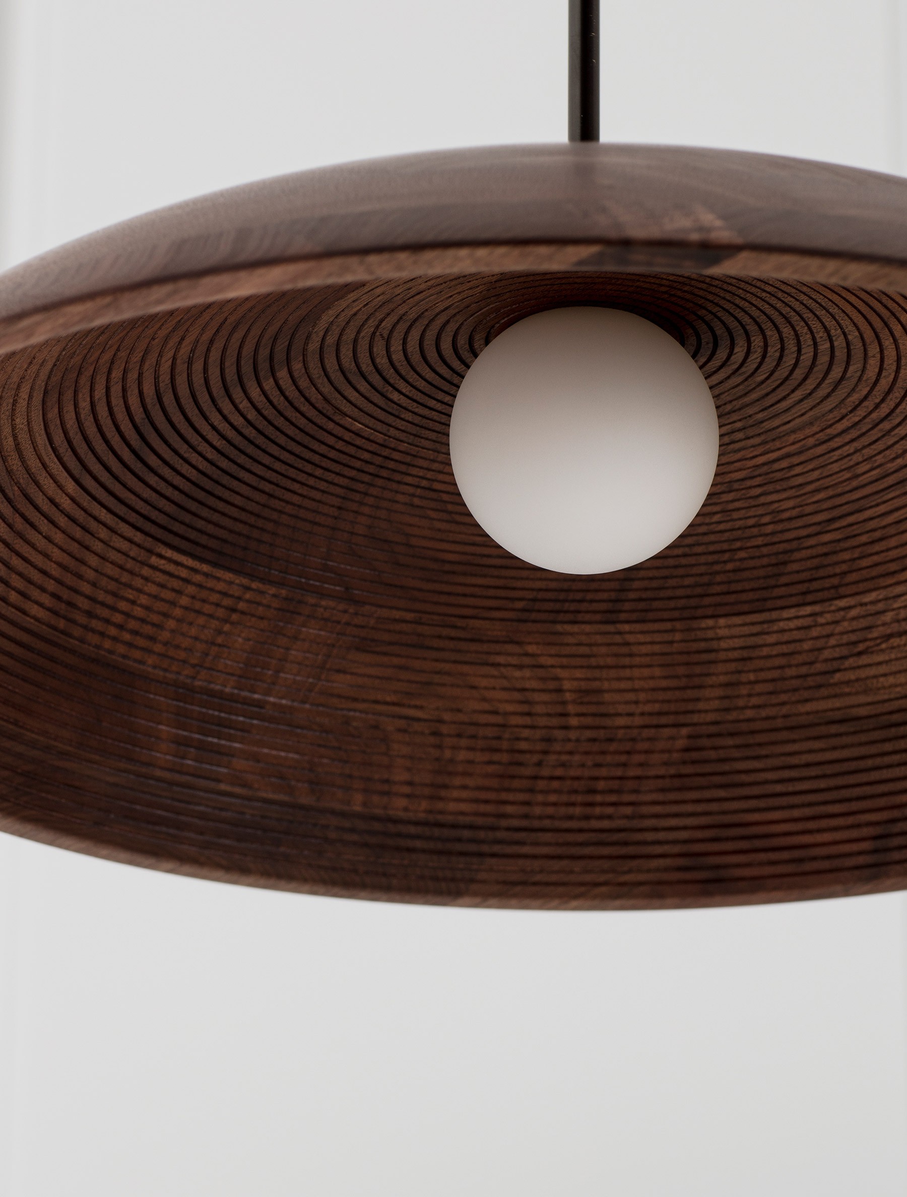 Concentric Pendant 20" detail shown in Blackened Brass, Black Walnut Dome, and Matte White Globe