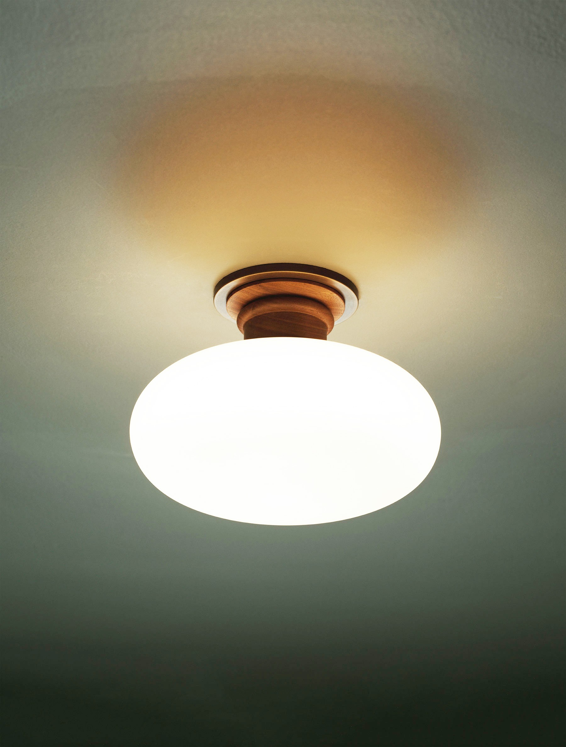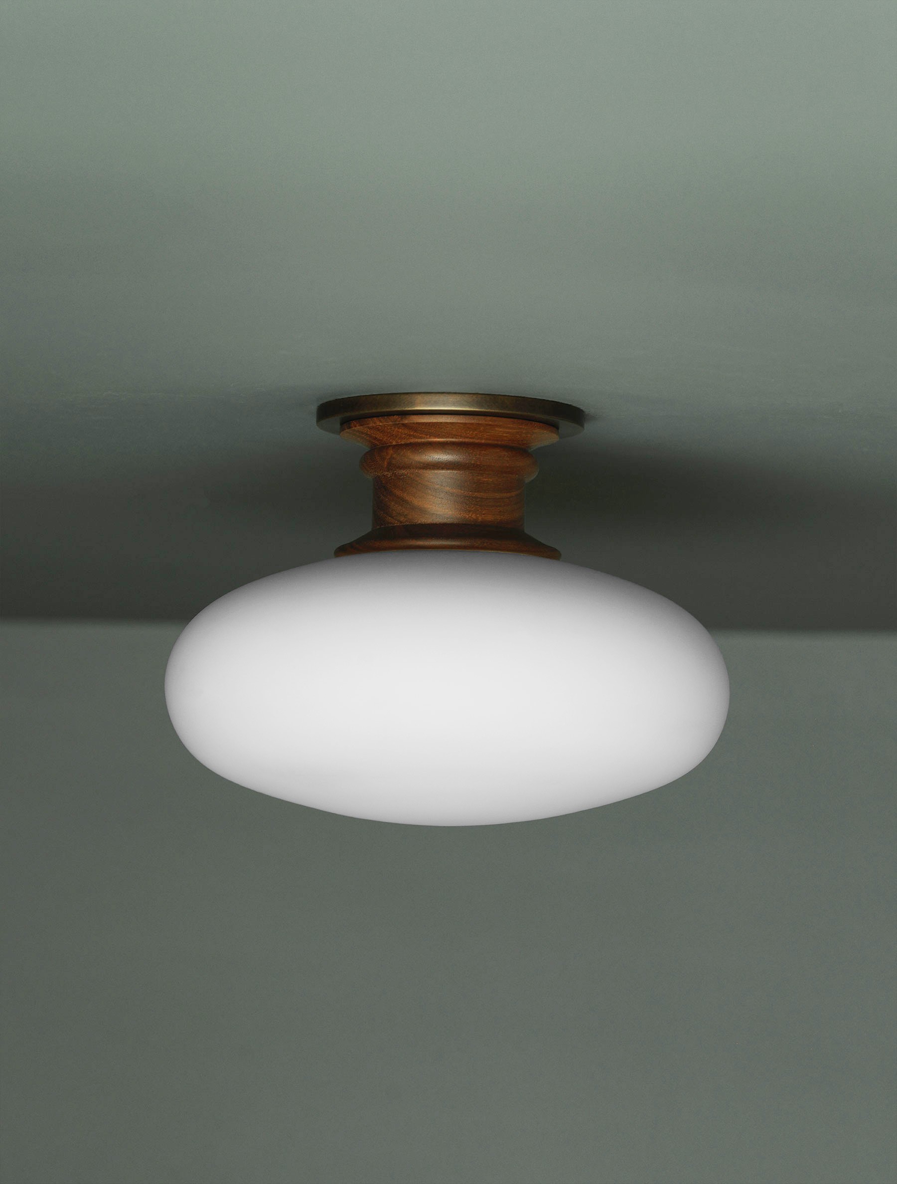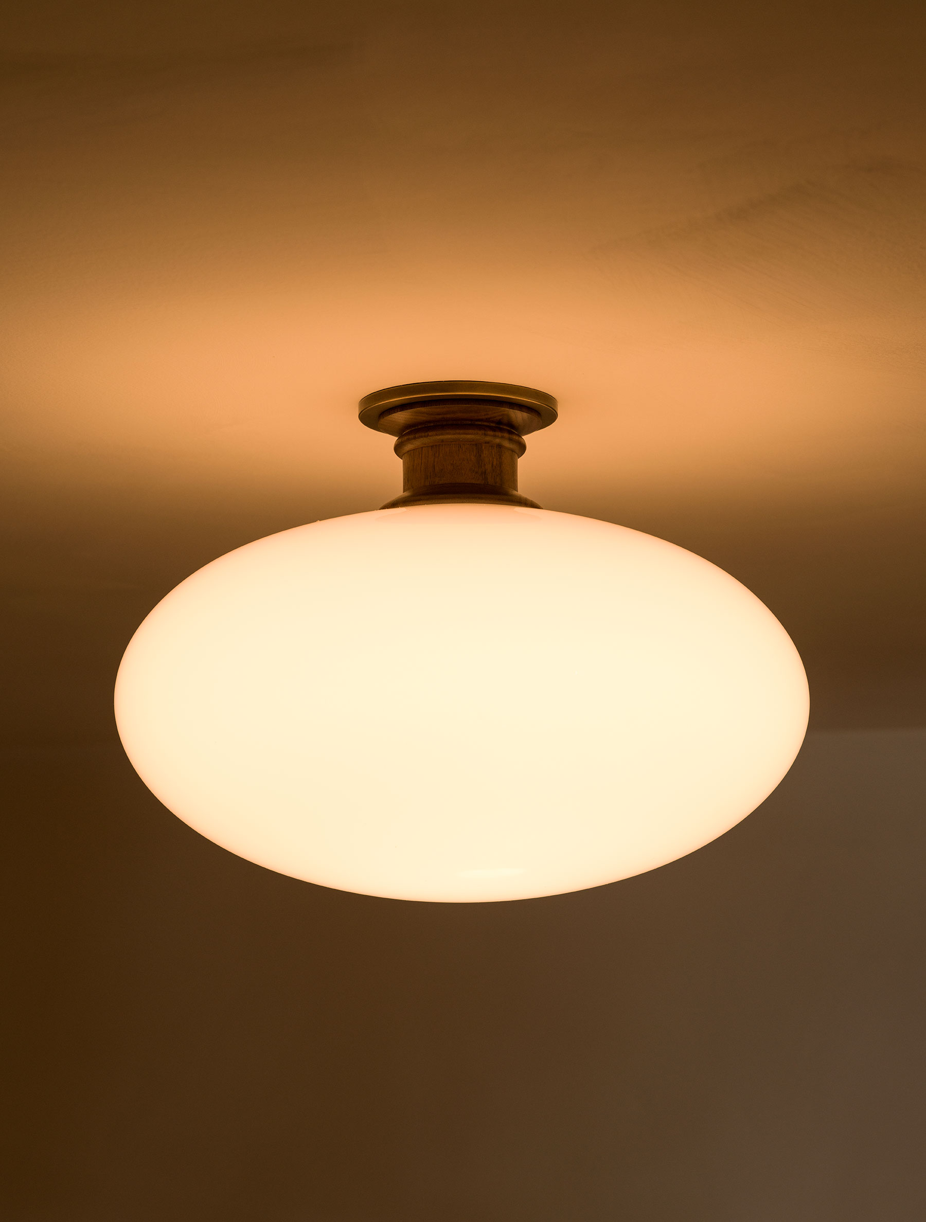 This ceiling or wall flush-mounted lighting fixture is made with only the highest quality materials - including an elliptical-shaped mouth-blown glass globe, turned wood standoff and a machined brass canopy detail - creating a light that is both beautiful and functional. The traditional hand beading on the wood turning detail adds warmth and charm, avoiding the too-modern feel, while experiencing all the simple pleasures it brings. With its rich textures, welcoming shape and versatility this product is simply easy to live with.