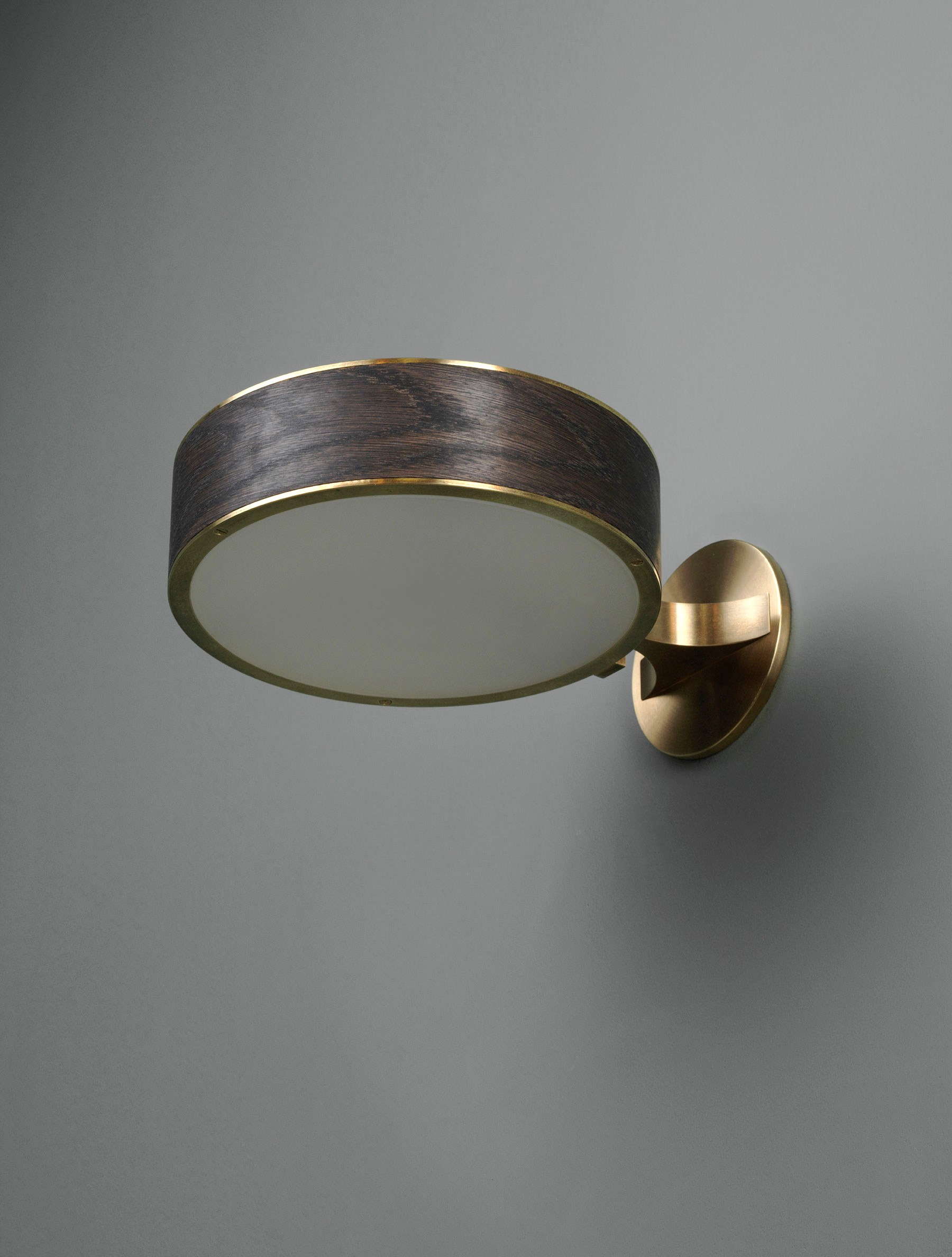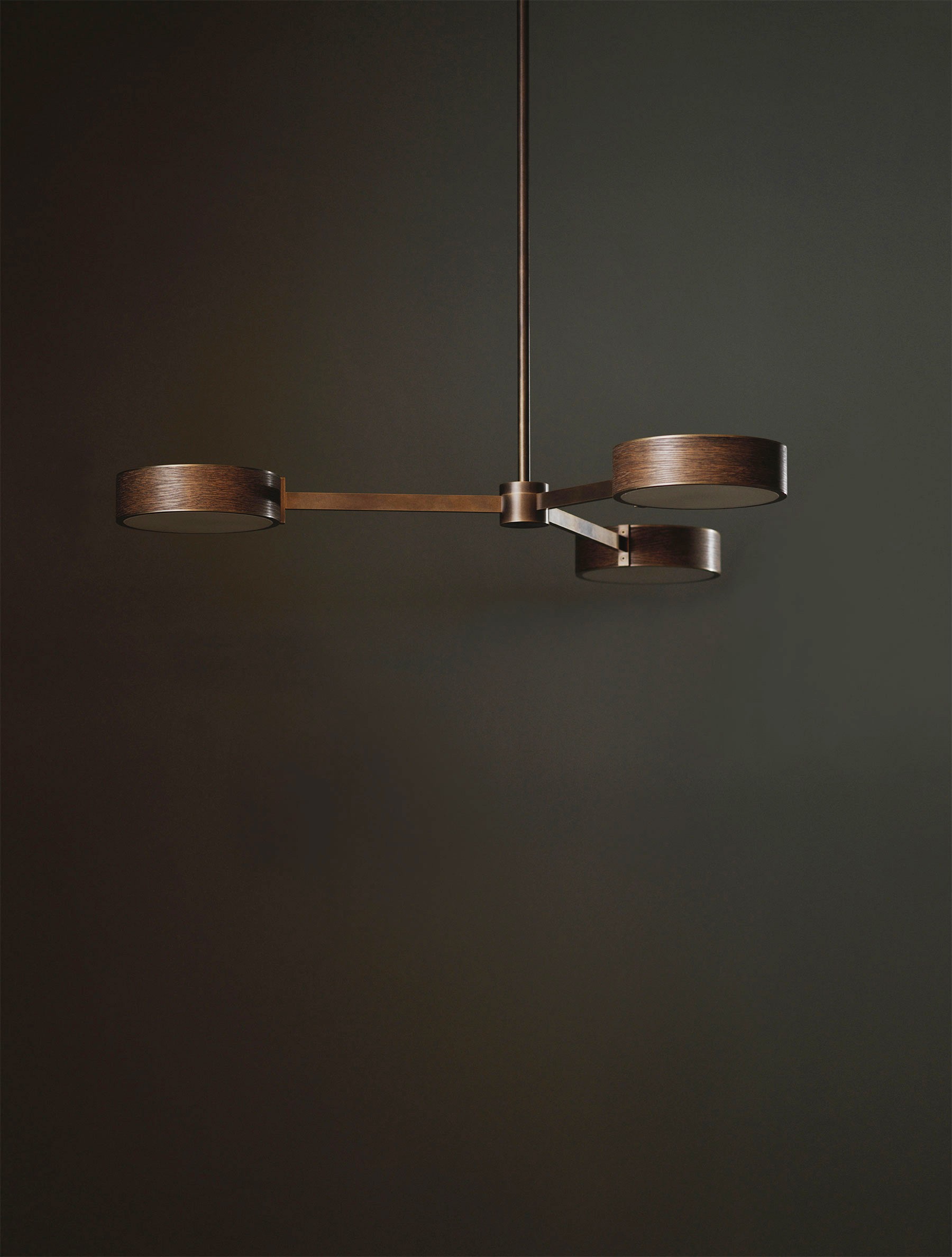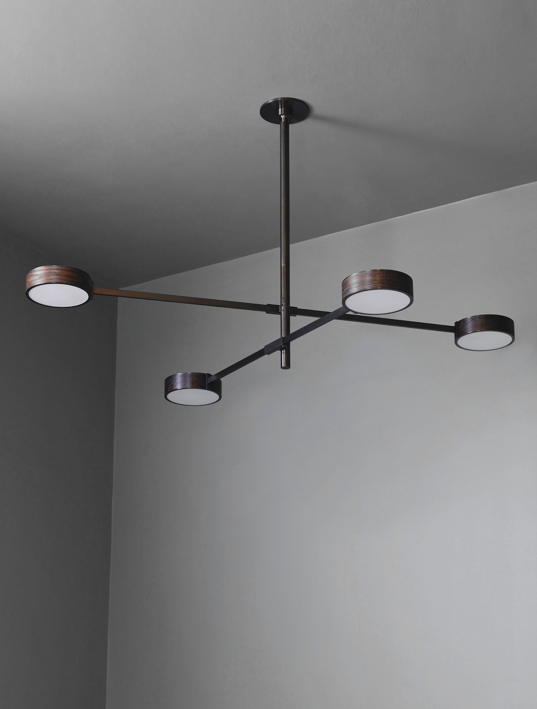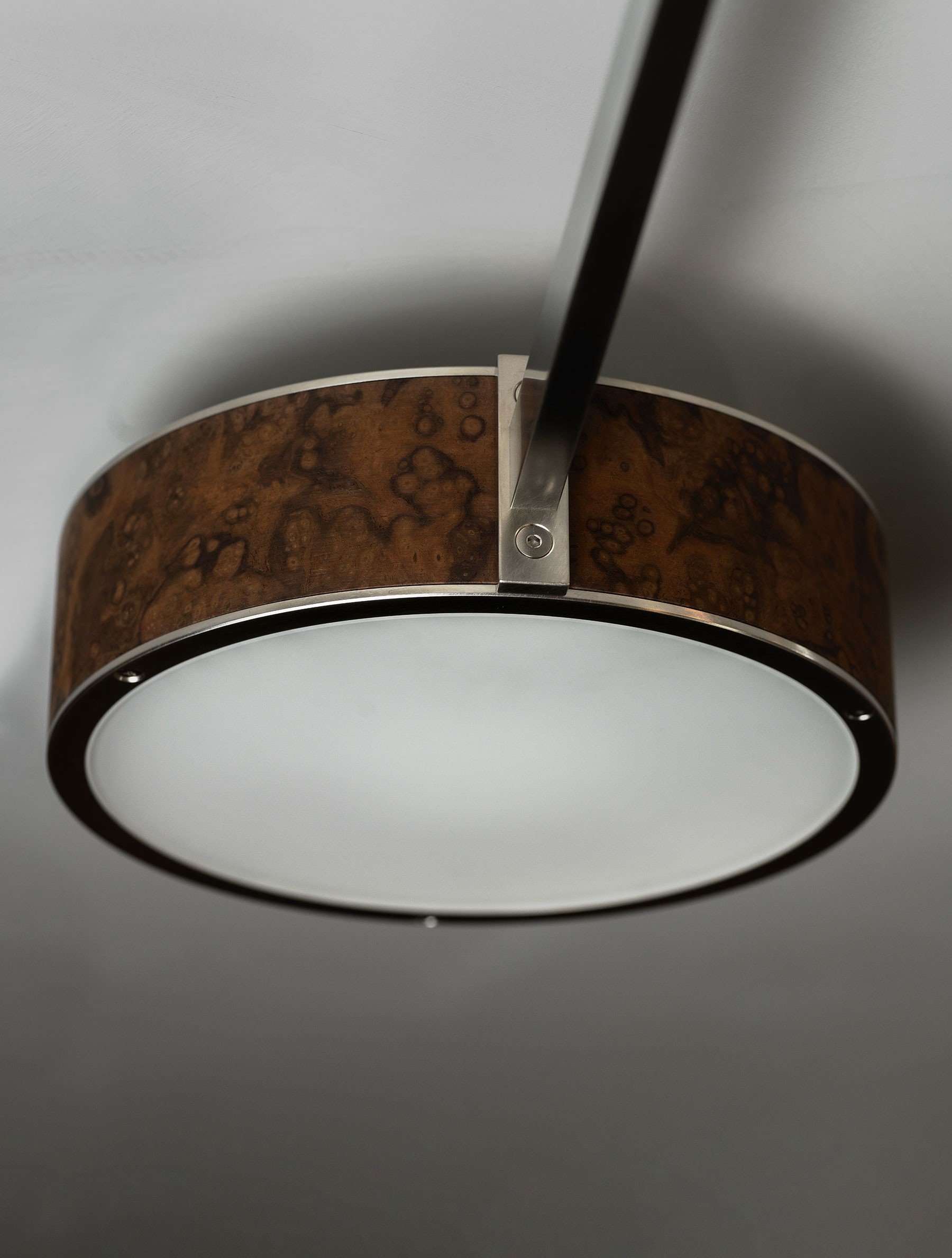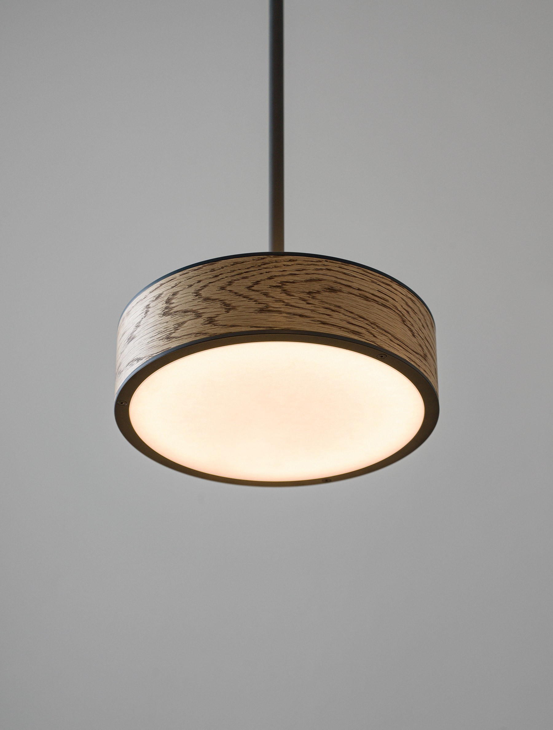 The Monoscope collection is an expression of simple yet richly textured geometry. Hardwood veneer is wrapped over an Aluminum LED core and diffused by borosilicate glass, and brass fittings. A skilled artisan brings together these materials to form an incredibly well-diffused and bright lighting fixture. Monoscope is not only beautiful but highly functional. Its light fills the room thanks to the disc-shaped shade that illuminates brightly on both sides; bouncing against the ceiling while providing direct illumination below.