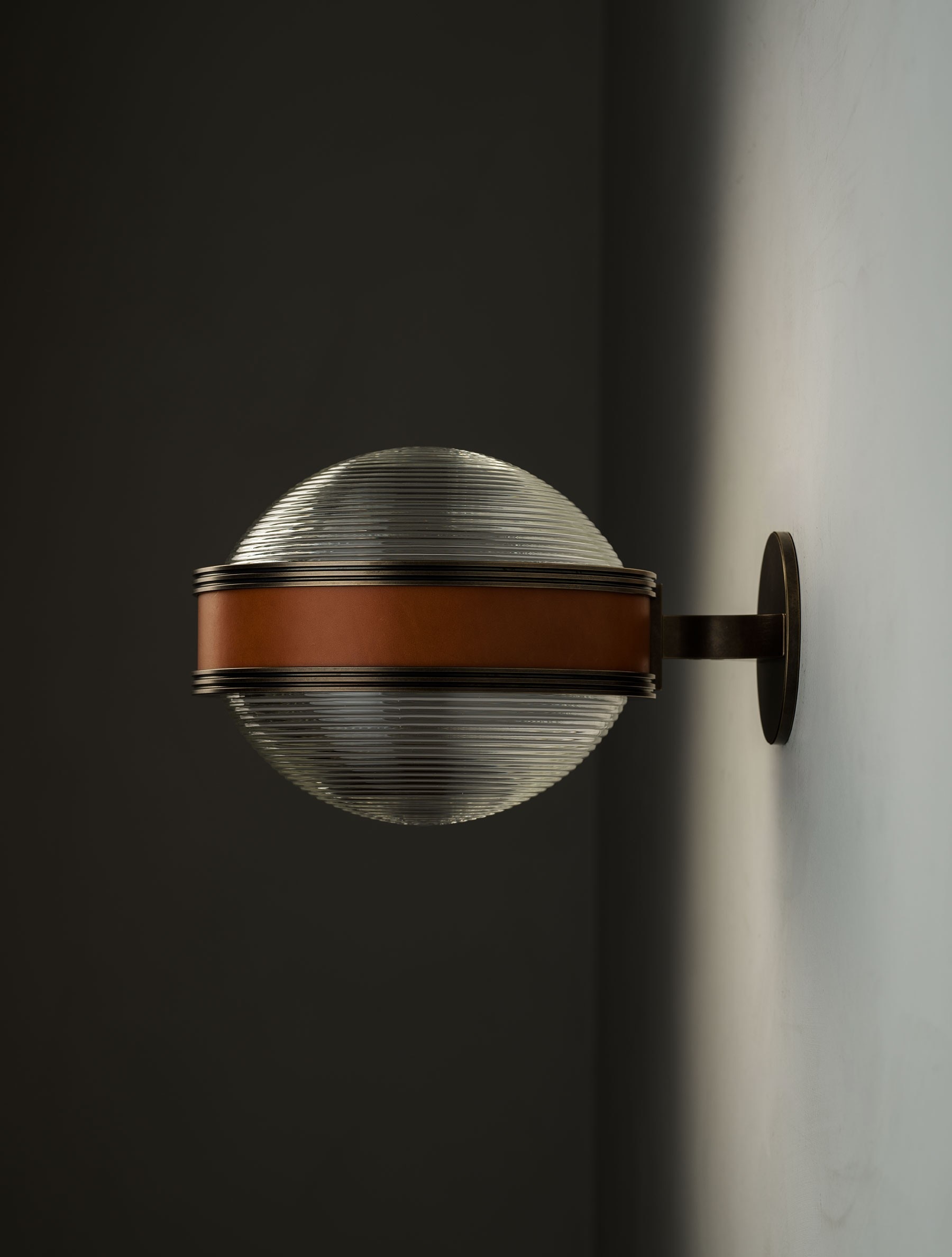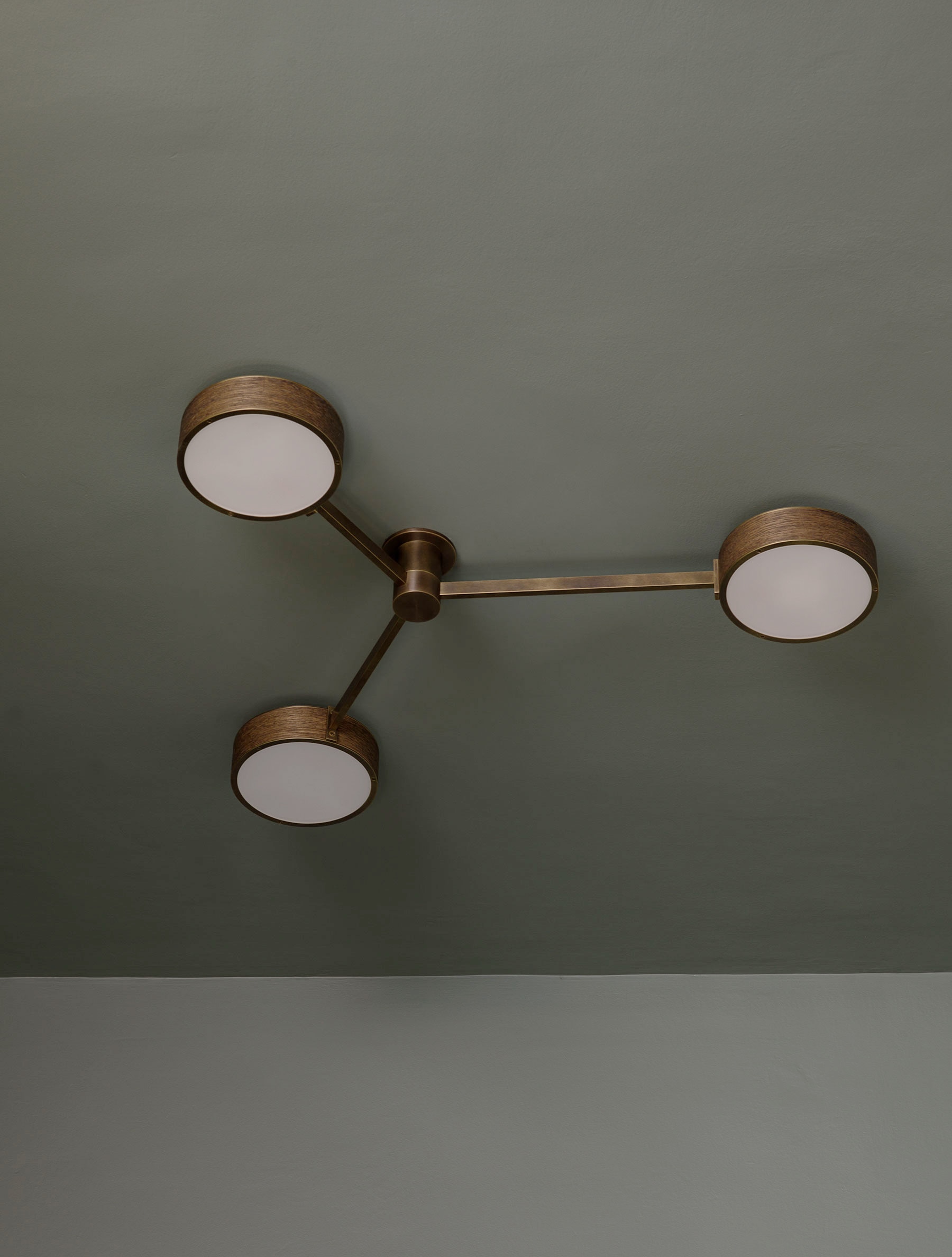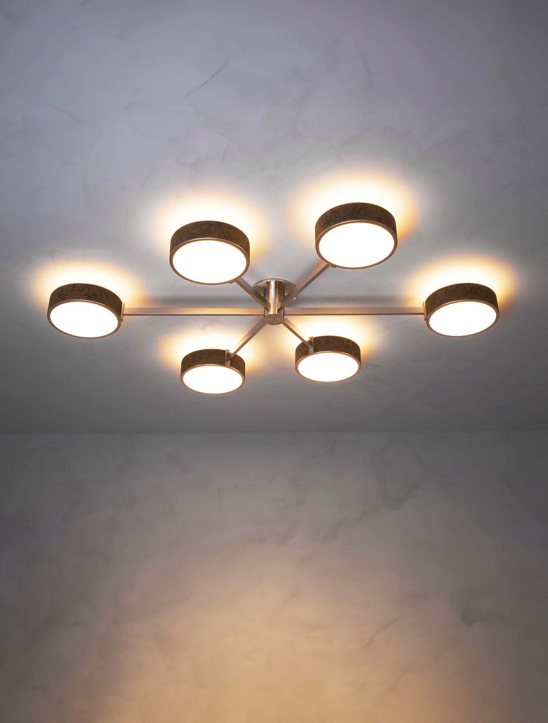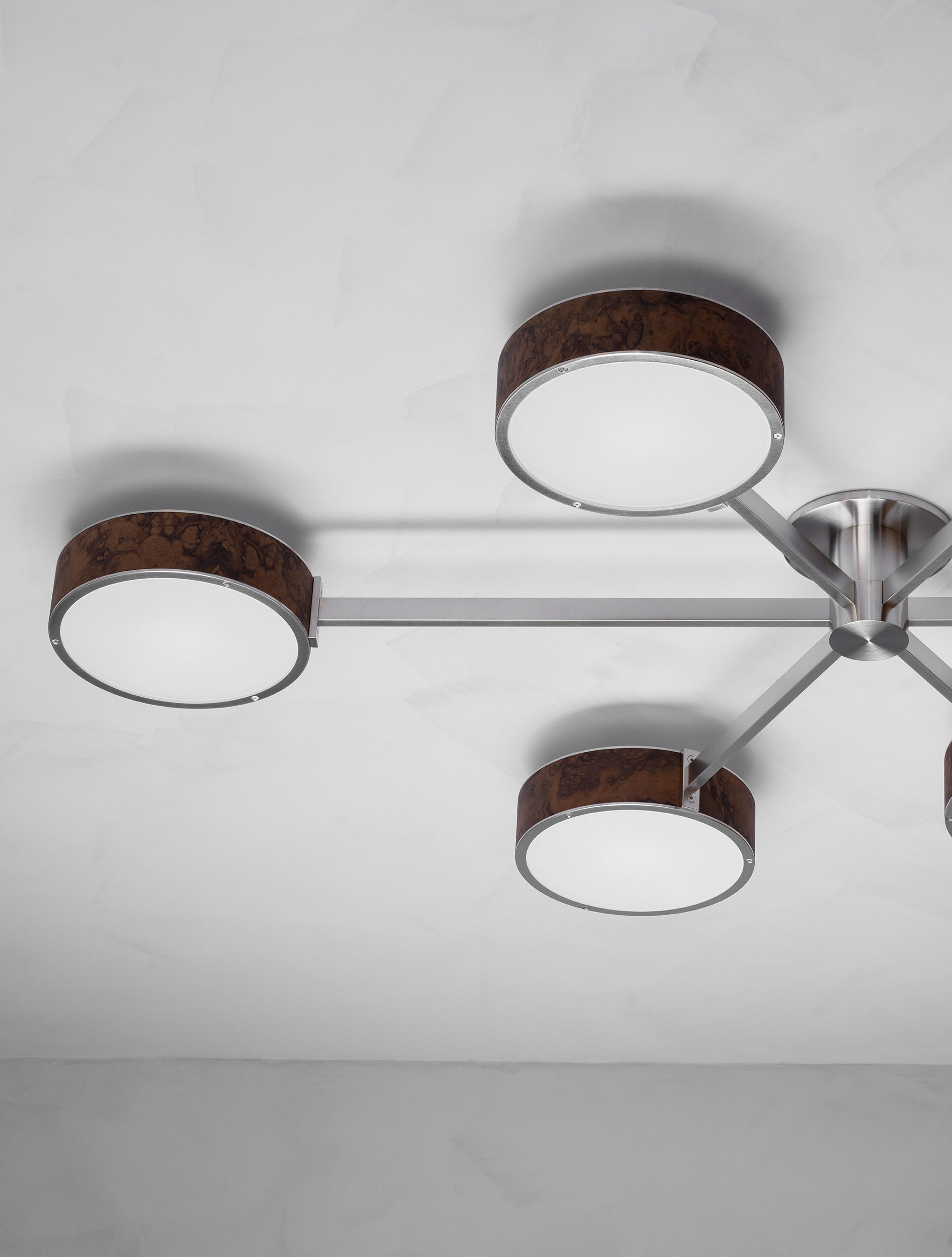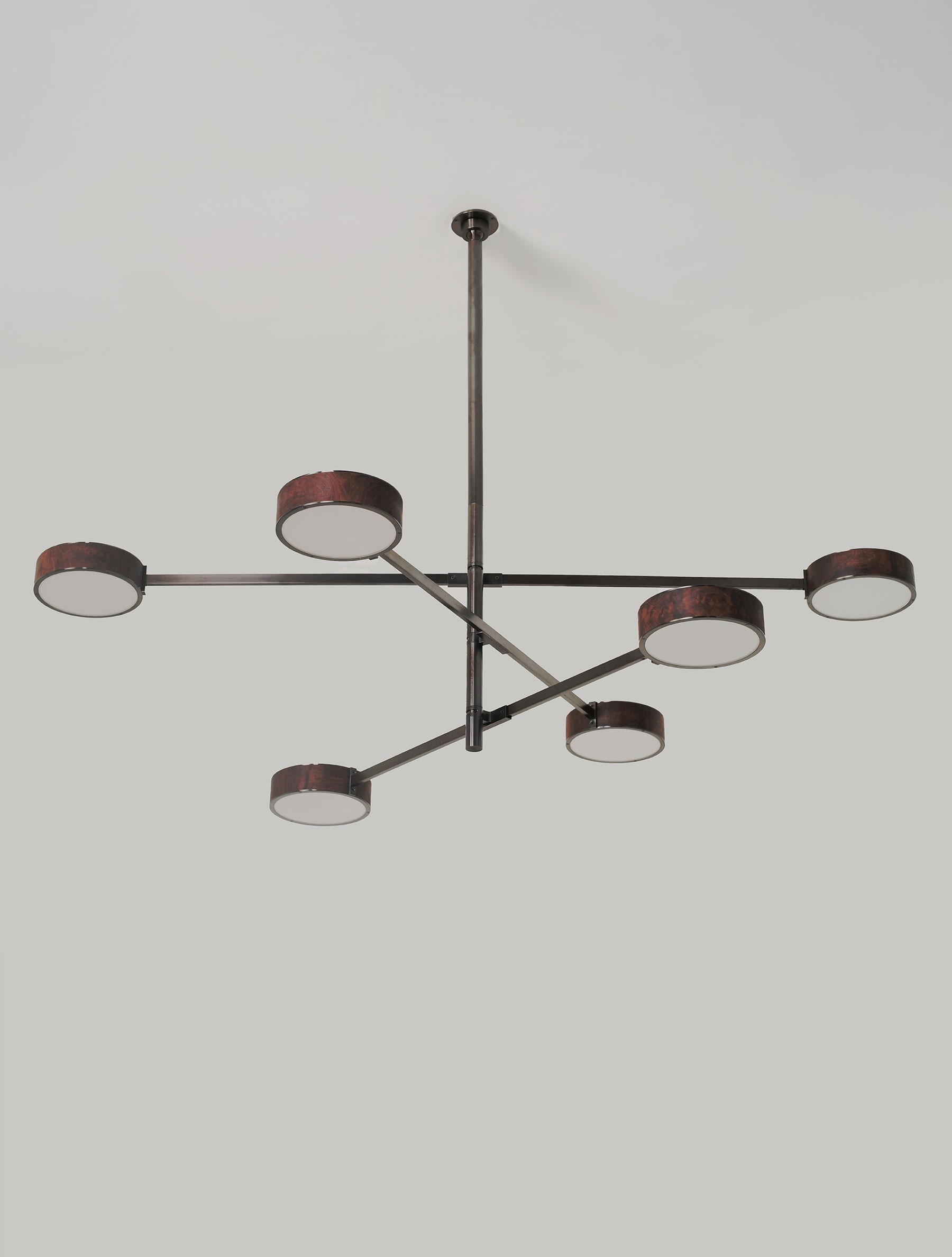 The Monoscope collection is an expression of simple yet richly textured geometry. Hardwood veneer is wrapped over an Aluminum LED core and diffused by borosilicate glass, and brass fittings. A skilled artisan brings together these materials to form an incredibly well-diffused and bright lighting fixture. Monoscope is not only beautiful but highly functional. Its light fills the room thanks to the disc-shaped shade that illuminates brightly on both sides; bouncing against the ceiling while providing direct illumination below.